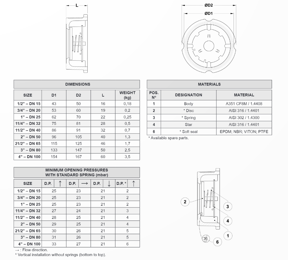 Về tiêu chuẩn an toàn thiết bị áp lực Châu Âu (PED – CE Marking nhóm 2): Các kích thước từ DN 15 đến DN 32 được phân loại SEP, trong khi các kích thước từ DN 40 đến DN 100 tuân thủ Category 1 (có đánh dấu CE).