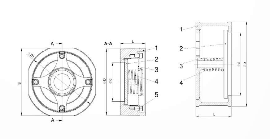- Cấu kiện nội bộ: Đĩa van (Disc) và lò xo (Spring) được gia công từ vật liệu thép không gỉ chuyên dụng (ví dụ mã X6CrNiMoTi17-12-2 đối với lò xo/đĩa van) để đảm bảo tuổi thọ và độ chính xác.